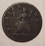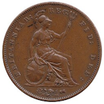 Farthing – The British farthing was a bronze coin equal to a quarter of a British penny or 1/960th of a pound sterling. Minted between 1860 and 1956, it was finally withdrawn from use in 1961. Replacing the earlier English farthing, it was initially minted in copper, and then later in bronze. The early English farthings were silver until copper ones were introduced by James I, and they were minted until 1707, when the Act of Union united England and Scotland. It was half the size of a ha’penny, or half a penny. There were 24 half pennies in a shilling and 480 in a pound.